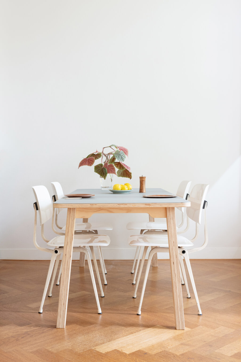 You can order this basic all plywood (25mm) table in various sizes and different Desktop (Forbo) colors. Desktop is a 2mm thick linoleum layer which gives the table a nice and warm soft touch. The table in the picture measures lxwxh; 1800x800x750mm.